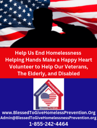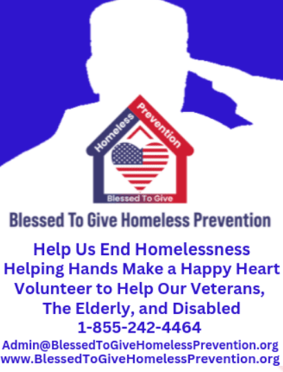 Blessed To Give is a nonprofit organization currently filed in the state of Texas; but with the intent of providing services nationwide. The objective of Blessed to Give is to prevent homelessness, primarily among our veterans, the elderly and those disabled who are more and more becoming displaced due to the cost of living that has now inflated beyond their fixed incomes.
